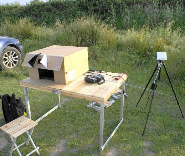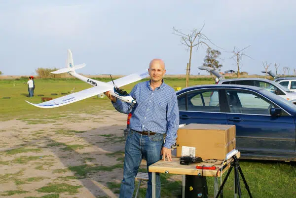 Paco was displaying what I would call shortly afterwards “the cinema” on the airfield. A laptop PC tucked into a cardboard box, cut out to make it easy to see the screen in sunlight, a simple tripod with a small antenna, an elapor sailboat with a small video camera, and some electronics on board, uuufff what is this?